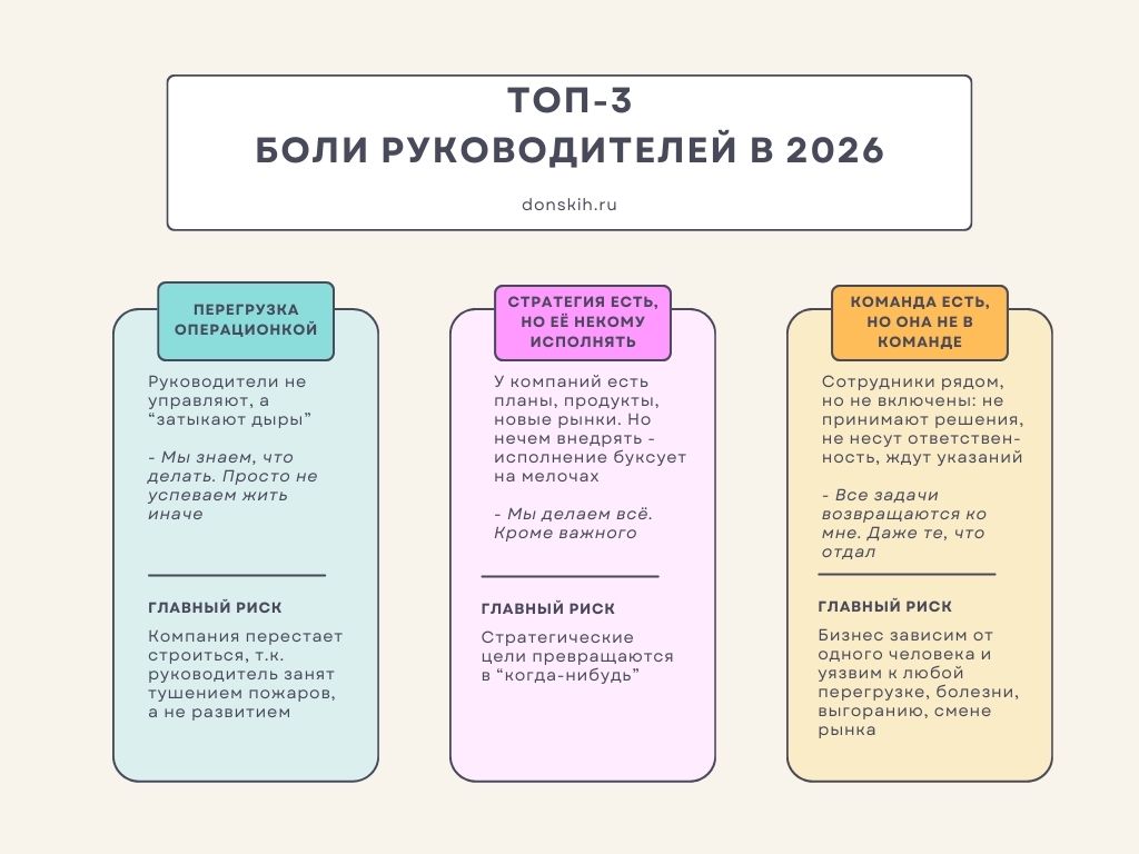 Один из собственников заметил: “Все задачи возвращаются ко мне. Даже те, что отдал”. Это не проблема сотрудников. Это отсутствующая управленческая архитектура. И именно она требует работы в 2026 году.
