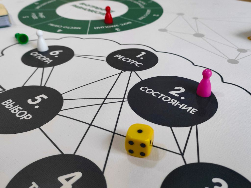 Каждая игровая сессия длится 2-3 часа. Участники бросают кубики, формулируют запрос, выбирают сегмент и исследуют его с разных сторон. Карточки расширяют контекст: задают вопросы, приглашают к осмыслению и поиску решений.